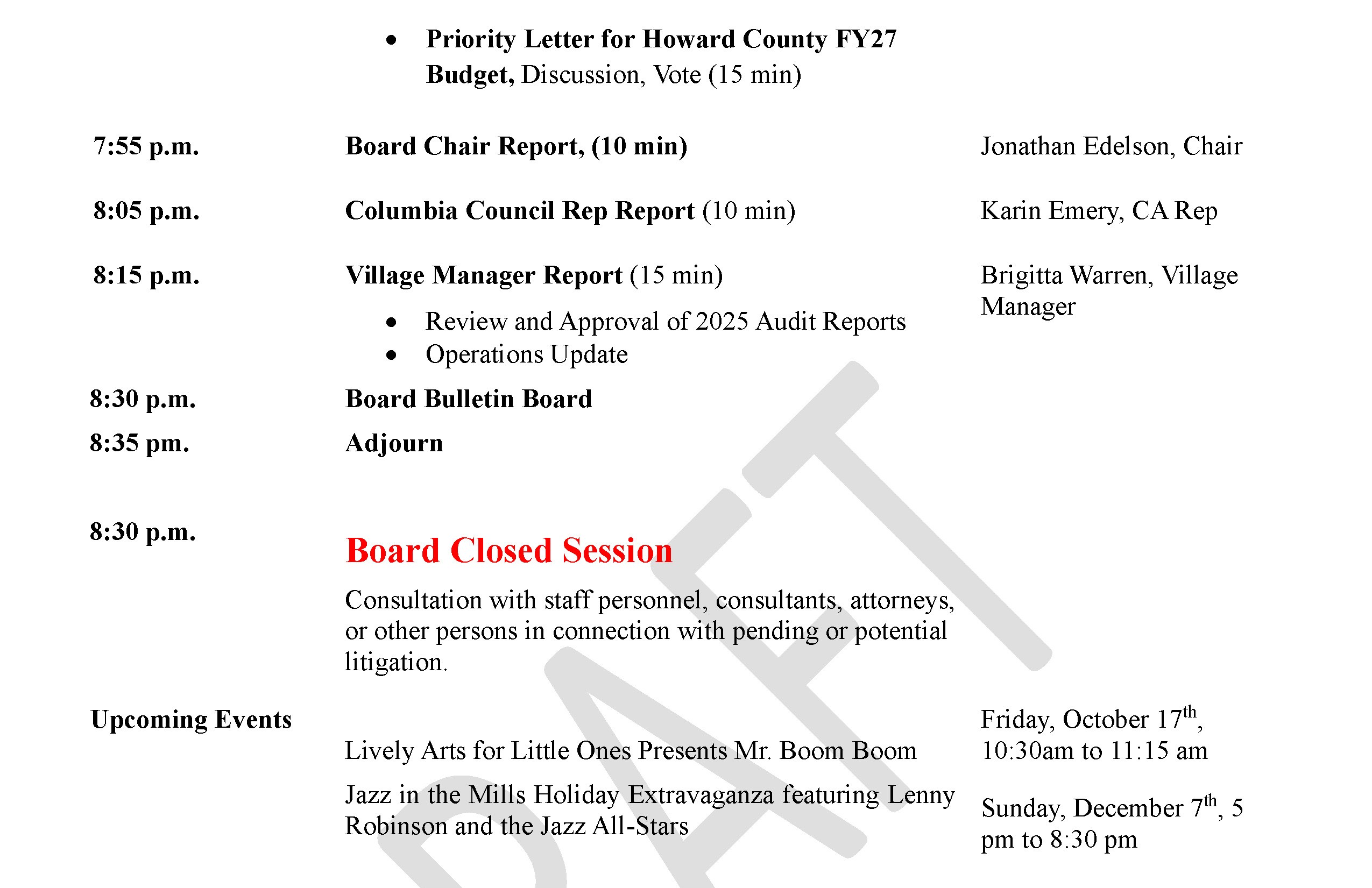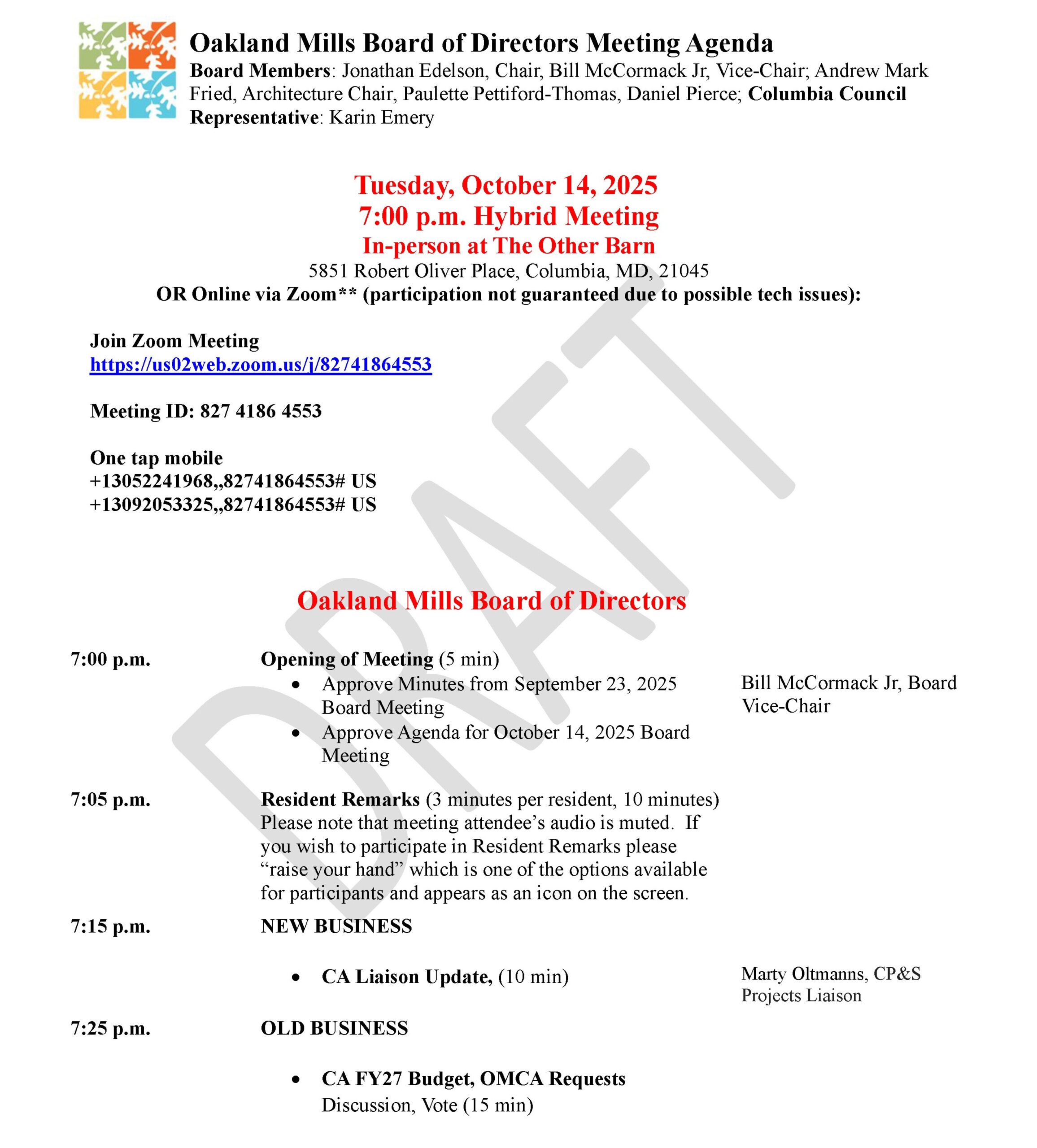 Calendar Categories Architecture Committee Appeal Board Meeting Children's Event Class Columbia Association Sponsored Event Committee Meeting Community Event Community Meeting Concert Election 2017 Elections 2019 Elections 2021 Elections 2022 Elections 2023 Elections 2024 Elections 2025 Fall Festival Holiday Jazz in the Mills Lively Arts Meeting NRAAC OM's 50th Birthday Celebration Pool Party RAC Application Deadline RAC Meeting Task Force Meeting Tenant Committee Meeting The Other Barn Office Virtual Event Vote Workshop Tags #hocoevents #totallyho #totallyhoco; #hocoevents #totoallyhoco Board Meeting Lively Arts for Little Ones totallyhoco Agenda Agenda Day Month Week October – December 2025 Oct – Dec 2025 Collapse All Expand All Oct 14 Tue OMCA Board Meeting @ Hybrid Meeting: The Other Barn and on Zoom Tickets Oct 14 @ 7:00 pm – 9:00 pm Hybrid meeting, held at The Other Barn and on Zoom.Zoom link: https://us02web.zoom.us/j/82741864553 Oct 15 Wed Open Space Advisory Committee Meeting @ The Other Barn Tickets Oct 15 @ 7:00 pm – 8:30 pm Oct 16 Thu RAC Meeting @ Online meeting only Tickets Oct 16 @ 7:00 pm – 8:00 pm List of ApplicationsZoom link: https://us02web.zoom.us/j/88116152896 Oct 28 Tue OMCA Board Meeting @ Hybrid Meeting: The Other Barn and on Zoom Tickets Oct 28 @ 7:00 pm – 9:00 pm Oct 29 Wed Housing Committee Meeting @ The Other Barn Tickets Oct 29 @ 7:00 pm – 8:30 pm Nov 6 Thu RAC Meeting @ Online meeting only Tickets Nov 6 @ 7:00 pm – 8:00 pm Nov 11 Tue OMCA Board Meeting @ Hybrid Meeting: The Other Barn and on Zoom Tickets Nov 11 @ 7:00 pm – 9:00 pm Nov 20 Thu RAC Meeting @ Online meeting only Tickets Nov 20 @ 7:00 pm – 8:00 pm Nov 25 Tue OMCA Board Meeting @ Hybrid Meeting: The Other Barn and on Zoom Tickets Nov 25 @ 7:00 pm – 8:00 pm Dec 9 Tue OMCA Board Meeting @ Hybrid Meeting: The Other Barn and on Zoom Tickets Dec 9 @ 7:00 pm – 8:00 pm October – December 2025 Oct – Dec 2025 Subscribe to filtered calendar Add to Timely Calendar Add to Google Add to Outlook Add to Apple Calendar Add to other calendar Export to XML