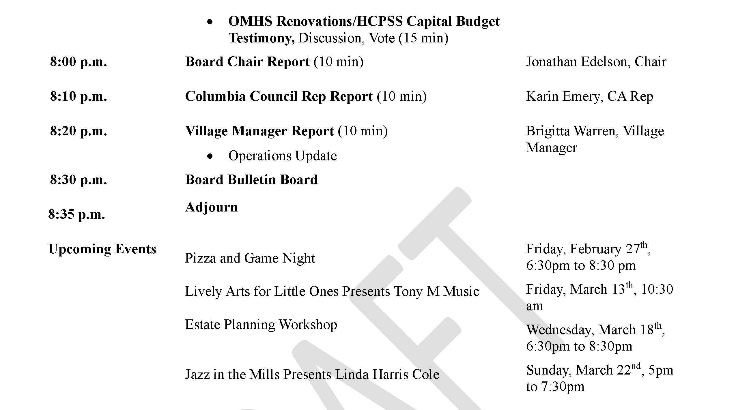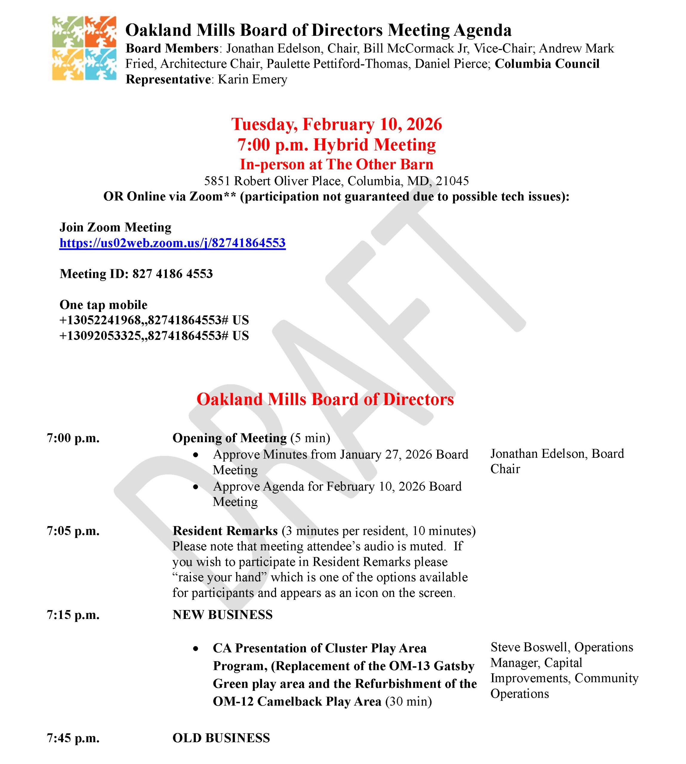 Meetings Categories Architecture Committee Appeal Board Meeting Children's Event Class Columbia Association Sponsored Event Committee Meeting Community Event Community Meeting Concert Election 2017 Elections 2019 Elections 2021 Elections 2022 Elections 2023 Elections 2024 Elections 2025 Fall Festival Holiday Jazz in the Mills Lively Arts Meeting NRAAC OM's 50th Birthday Celebration Pool Party RAC Application Deadline RAC Meeting Task Force Meeting Tenant Committee Meeting The Other Barn Office Virtual Event Vote Workshop Tags #hocoevents #totallyho #totallyhoco; #hocoevents #totoallyhoco Board Meeting Lively Arts for Little Ones totallyhoco Agenda Agenda Day Month Week February – March 2026 Feb – Mar 2026 Collapse All Expand All Feb 10 Tue Board Meeting @ Hybrid Meeting: The Other Barn and on Zoom Tickets Feb 10 @ 7:00 pm – 9:00 pm Hybrid meeting held at The Other Barn and on Zoom.Zoom link: https://us02web.zoom.us/j/82741864553 Feb 19 Thu RAC Meeting @ Online meeting only Tickets Feb 19 @ 7:00 pm – 8:00 pm Feb 24 Tue OMCA Board Meeting @ Hybrid Meeting: The Other Barn and on Zoom Tickets Feb 24 @ 7:00 pm – 9:00 pm Mar 5 Thu RAC Meeting @ Online meeting only Tickets Mar 5 @ 7:00 pm – 8:00 pm Mar 10 Tue OMCA Board Meeting @ Hybrid Meeting: The Other Barn and on Zoom Tickets Mar 10 @ 7:00 pm – 9:00 pm Mar 19 Thu RAC Meeting @ Online meeting only Tickets Mar 19 @ 7:00 pm – 8:00 pm Mar 24 Tue OMCA Board Meeting @ Hybrid Meeting: The Other Barn and on Zoom Tickets Mar 24 @ 7:00 pm – 9:00 pm February – March 2026 Feb – Mar 2026 Subscribe to filtered calendar Add to Timely Calendar Add to Google Add to Outlook Add to Apple Calendar Add to other calendar Export to XML Search for: Join Our Email List!Sign Up NowWant to Rent The Other Barn? Visit theotherbarn.org for venue information. Follow us! On Facebook: Oakland Mills Village The Other Barn OMCA Board Discussion Page On Instagram: oaklandmillsvillage Newsletters E-news School Happenings Community Links Oakland Mills Covenant Complaint Form SeeClickFix Report broken cable boxes Report a non-emergency crime or other issue